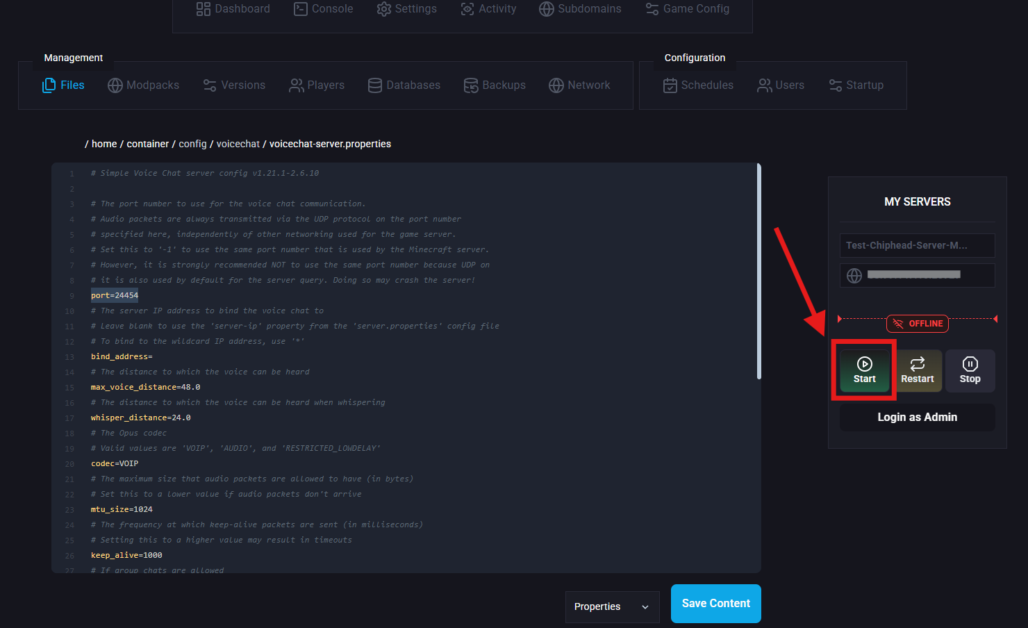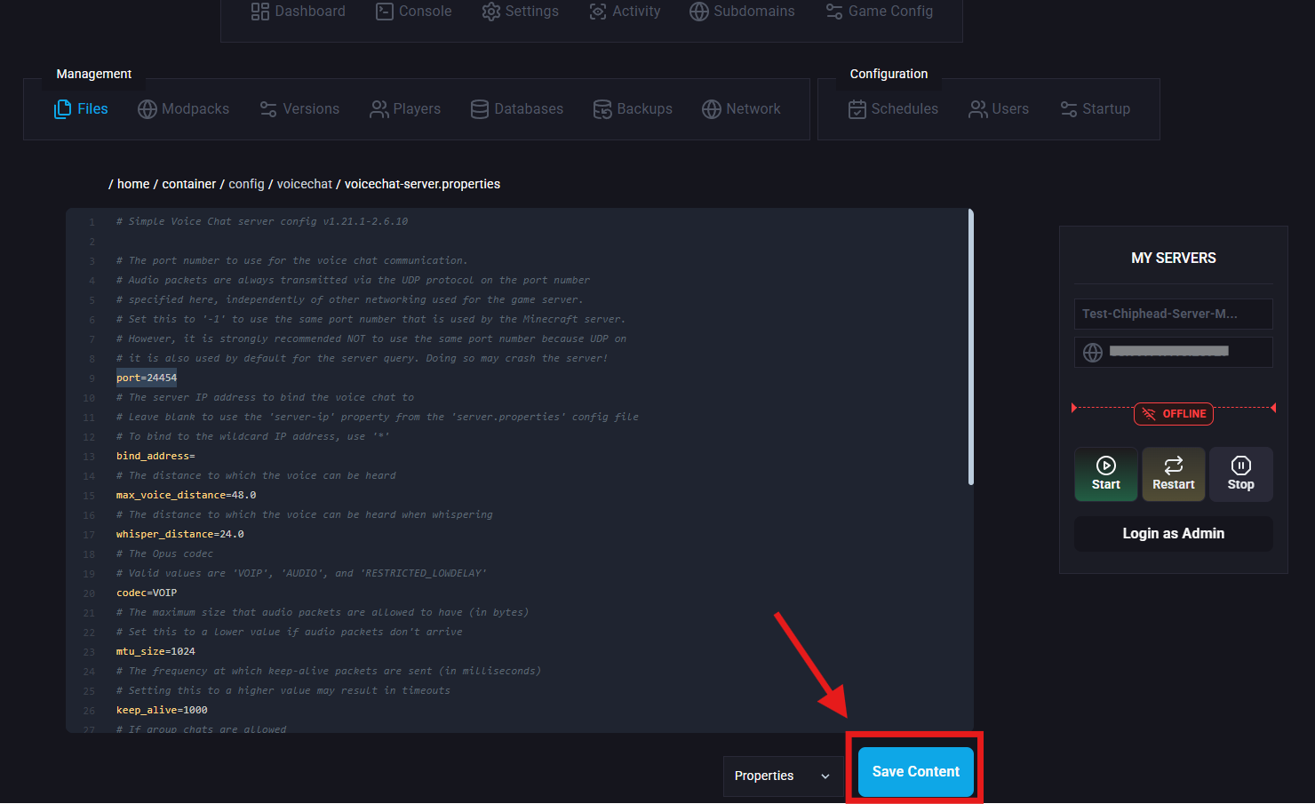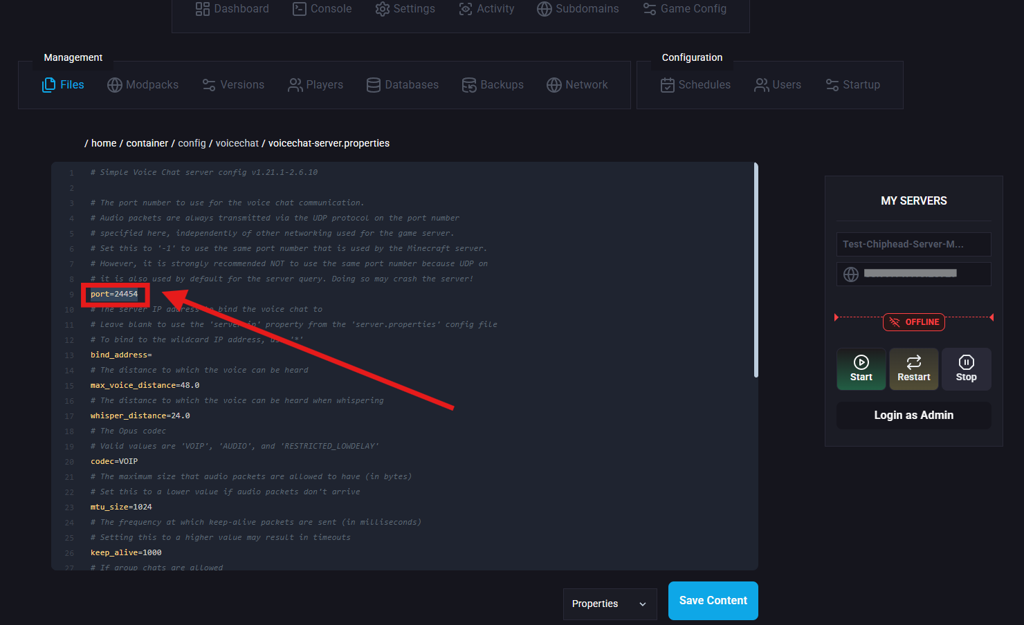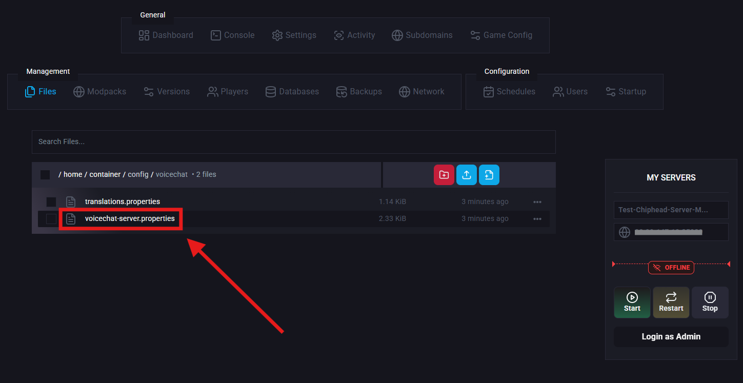 Navigate to /config/voicechat/ and open voicechat-server.properties.