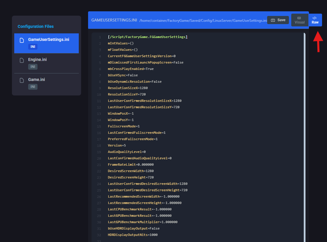 Go to “Game Config” & Select “GameUserSettings.ini”