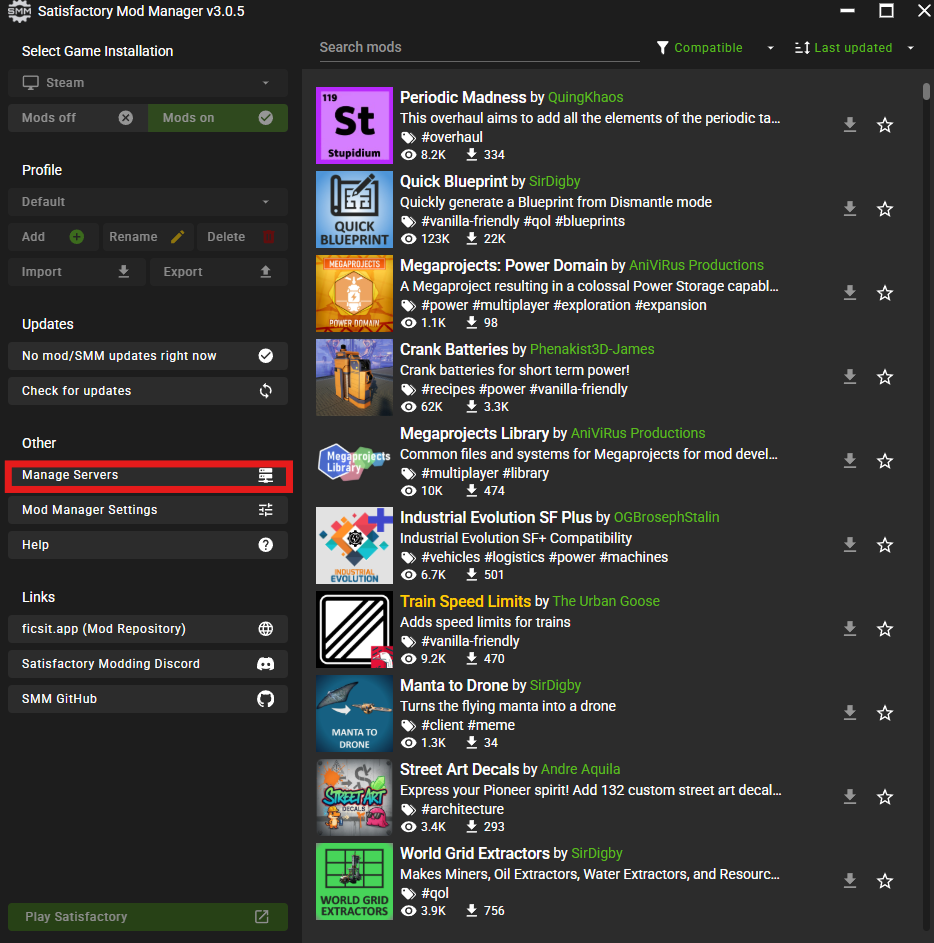 The Satisfactory Mod Manager (SMM) makes it easy to install mods, manage dependencies, and automatically set up the Satisfactory Mod Loader (SML).