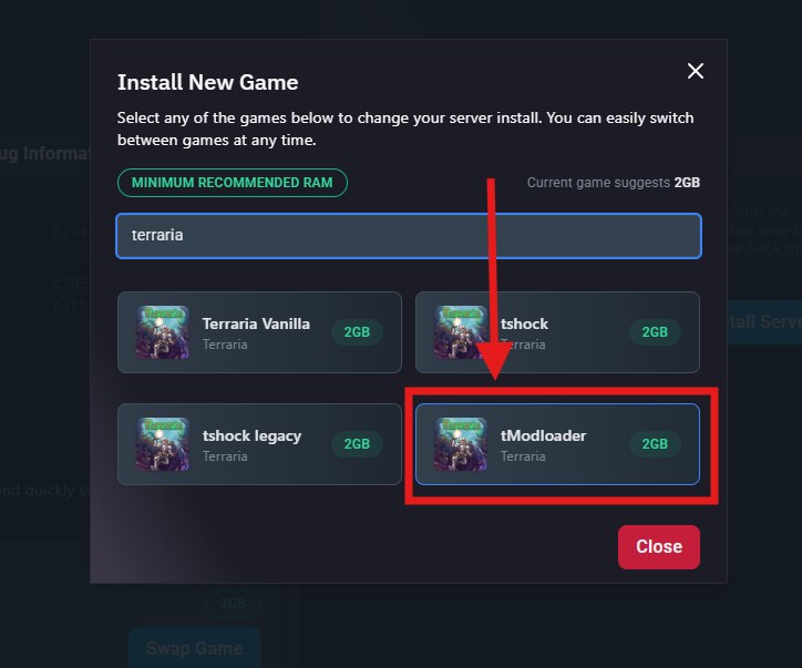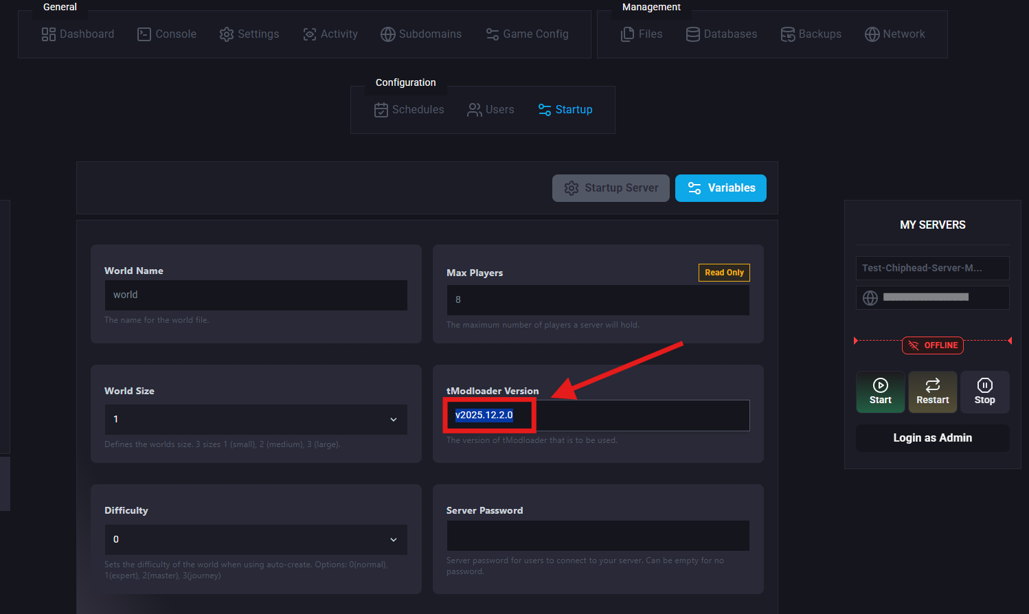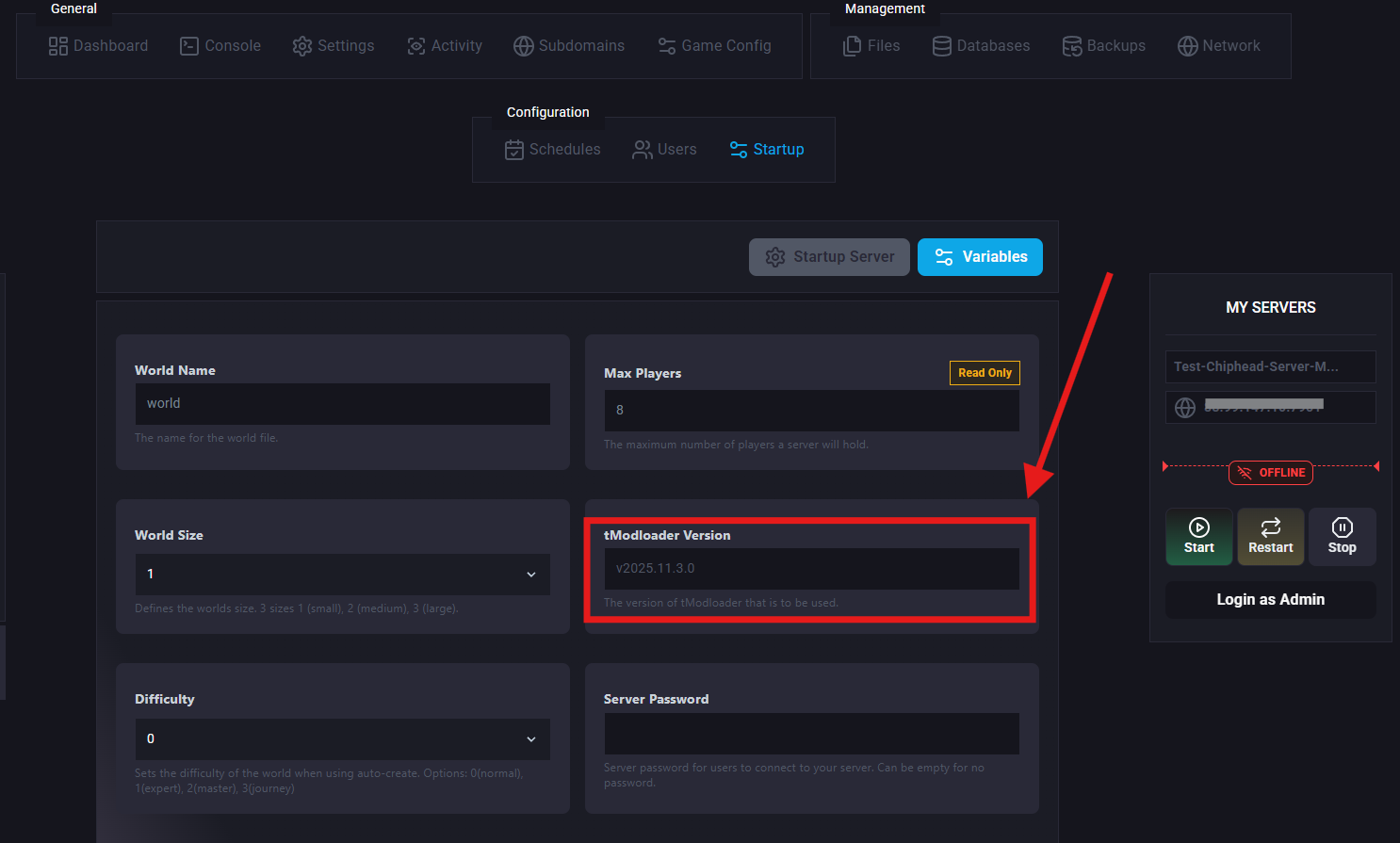 Once your server is installed navigate to Startup > Variables to change your tModLoader Version