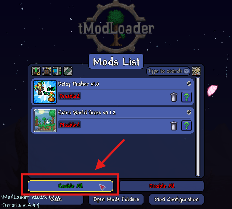 Select Enable All to activate your installed mods.