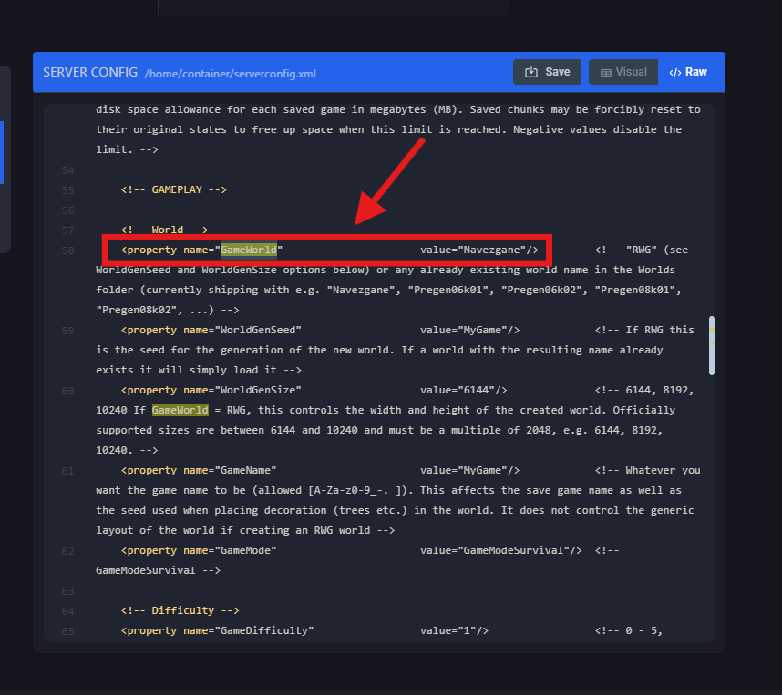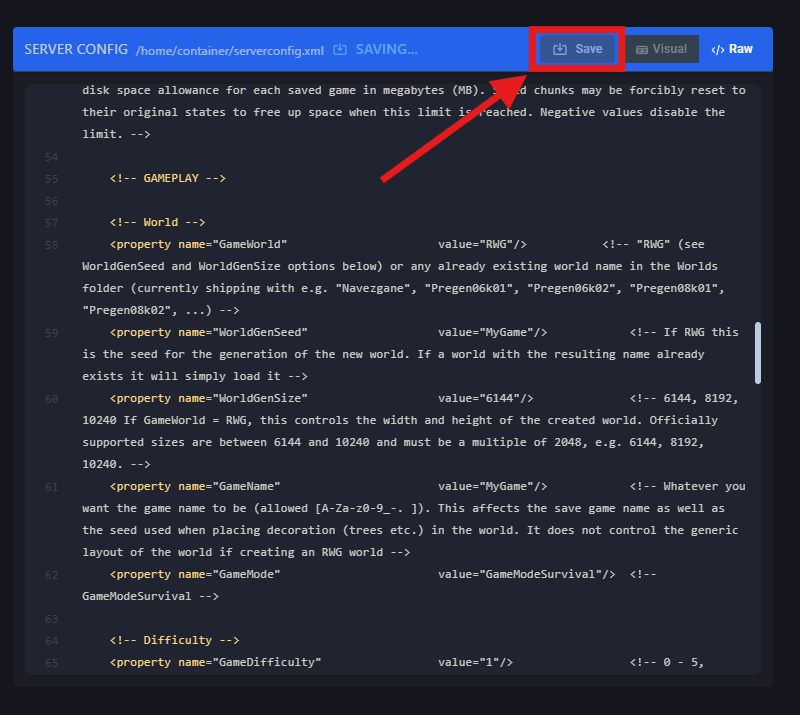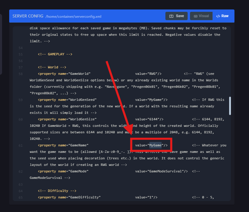 Click on </>Raw to access the serverconfig.xml file.