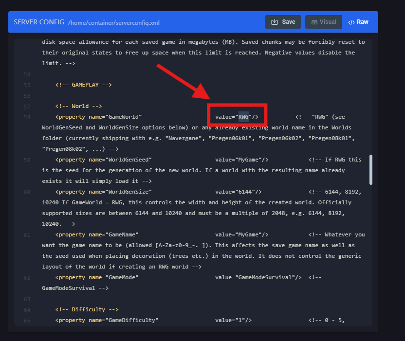 Set GameWorld to RWG within the quotation marks next to value=.