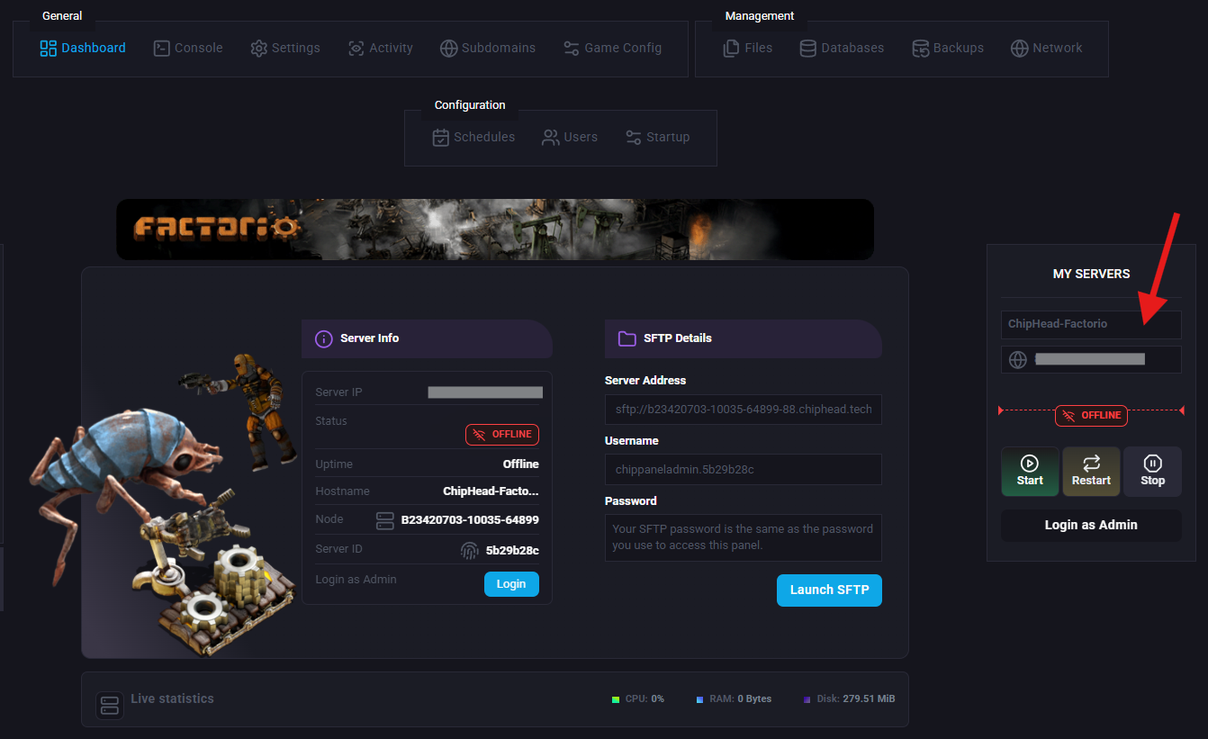 You can find your server’s IP address and port in the ChipHead Control Panel “My Servers” section