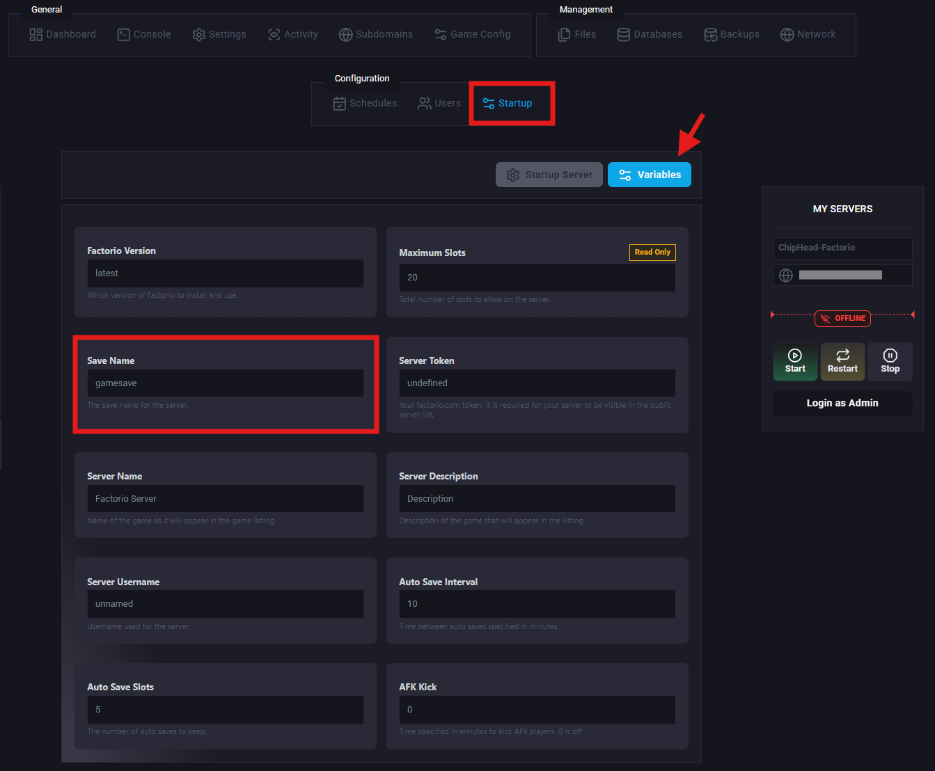 Navigate to the “Startup > Variables” In the Save Name field, enter the name of the uploaded file