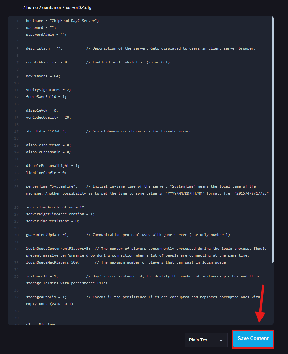 Go to the Files tab & Navigate to the serverDZ.cfg file.