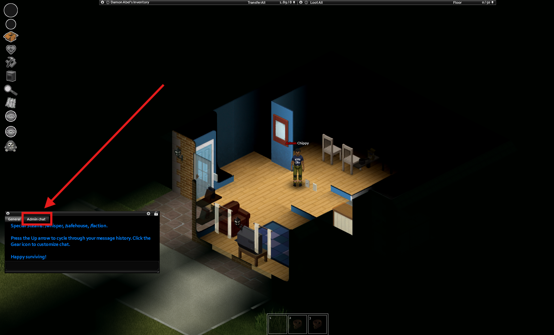 Once in-game, click the Admin icon on the left side of the screen.