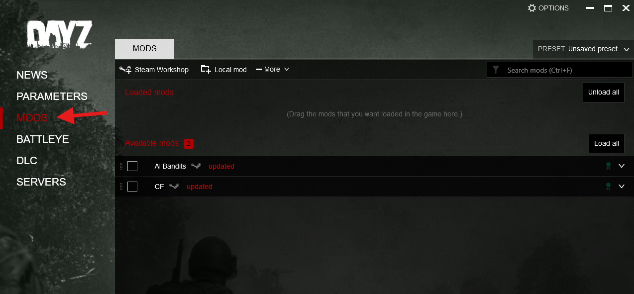 Launch DayZ and open the MODS tab.