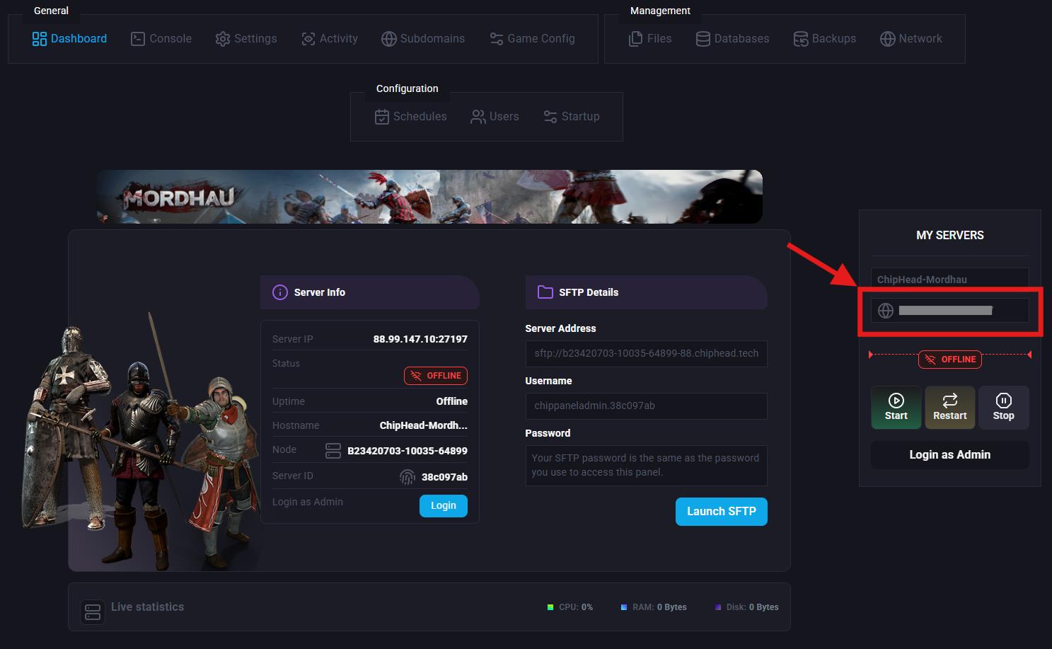 Copy the IP and Port from the “My Servers” section