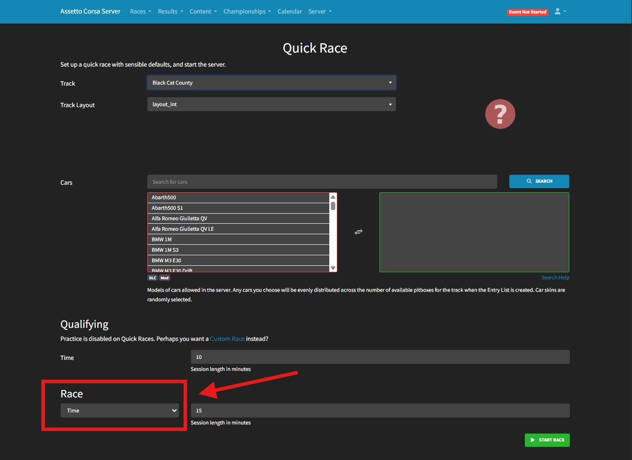 Select a Race Type from the dropdown (timed or lap-based) and set the race duration or number of laps.