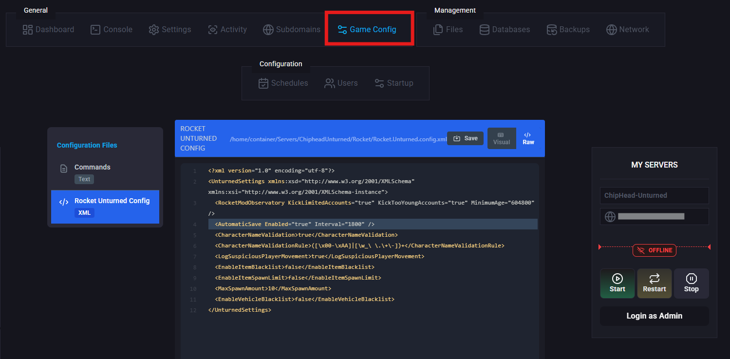 Go to “Game Config” & Select “Rocket Unturned Config”