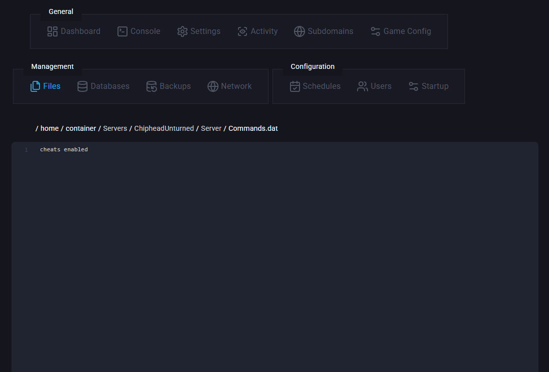 Navigate to the following directory: /ChipheadUnturned/Server/Commands.dat & Open the Commands.dat file.