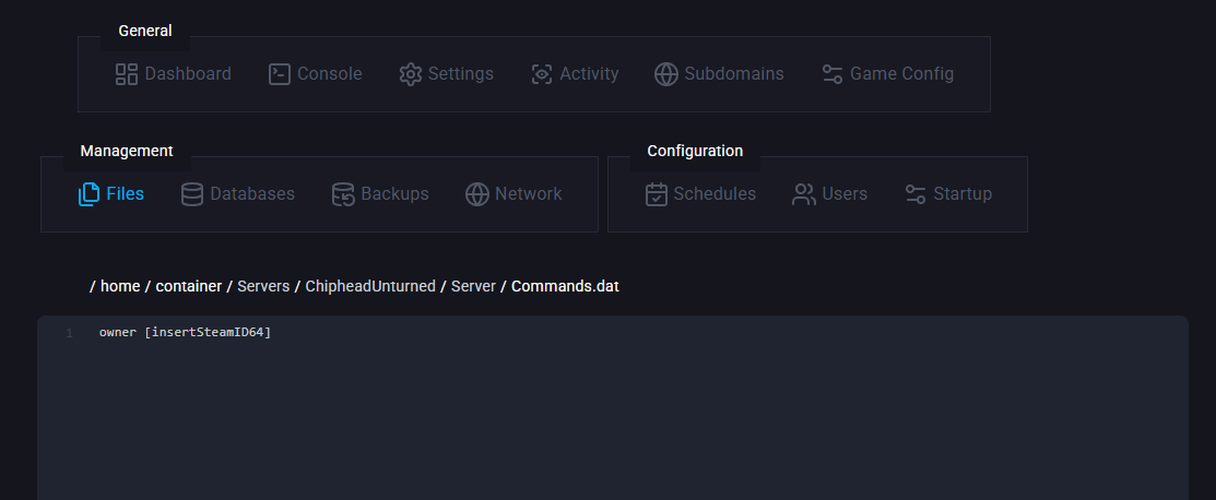 Go to the Files tab & Navigate to the following directory: /ChipheadUnturned/Server/Commands.dat