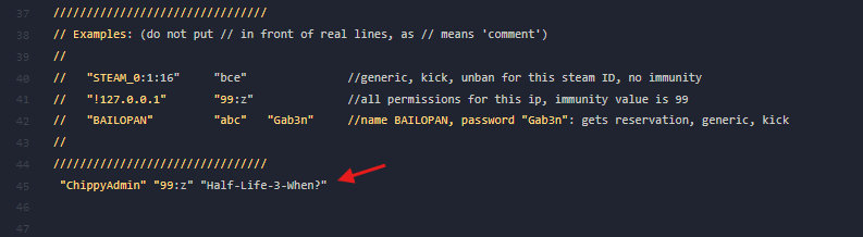 At the bottom of the file, add the player’s SteamID \ Name, immunity level, and permission flags using this format: