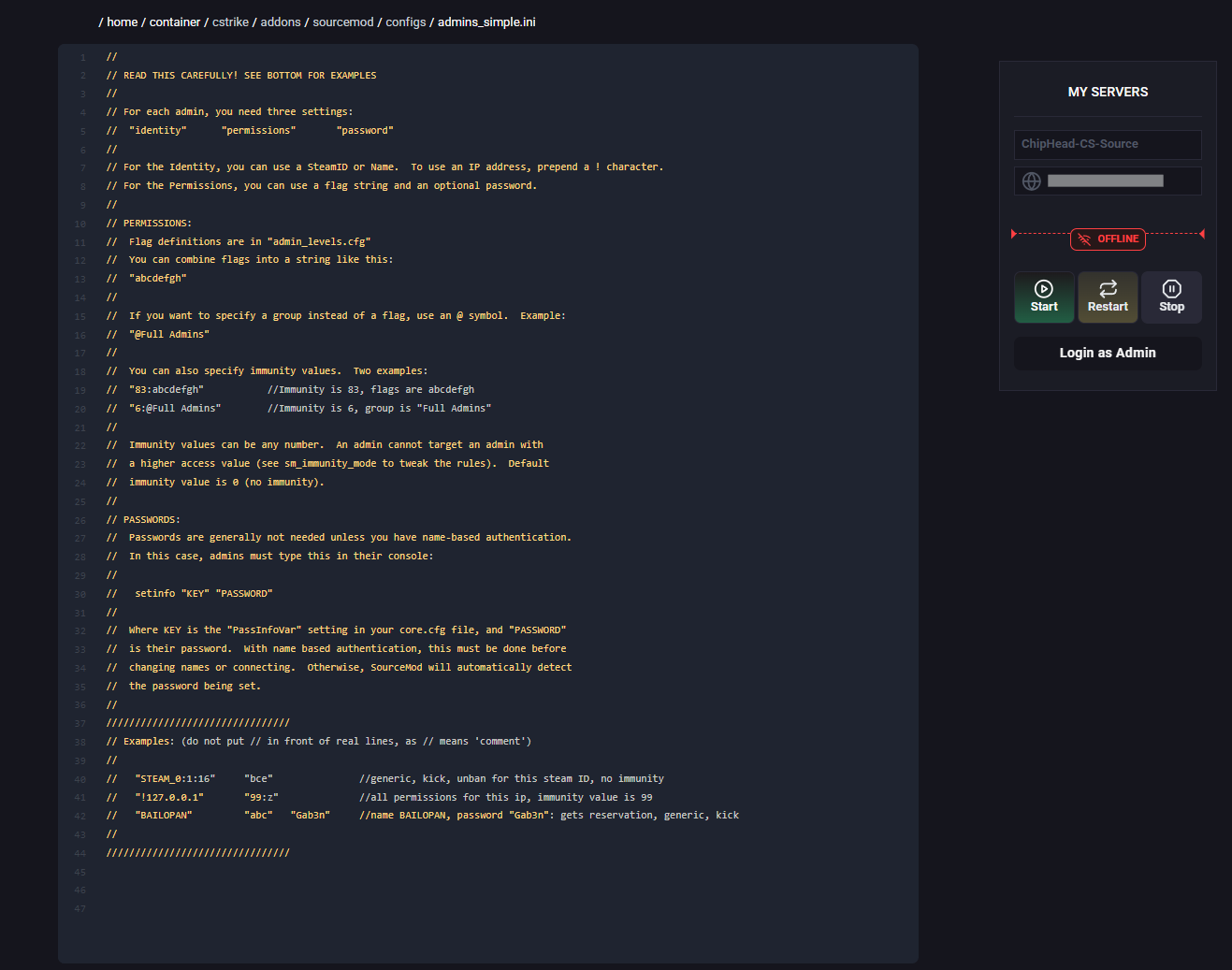 After deciding on each admin’s permission and immunity levels, you’ll need to add them to your admins_simple.ini file.