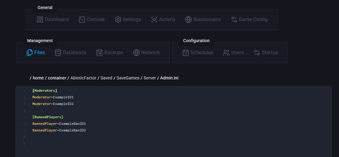 Go to the files tab & navigate to “home/container/AbioticFactor/Saved/SaveGames/Server” & open Admin.ini