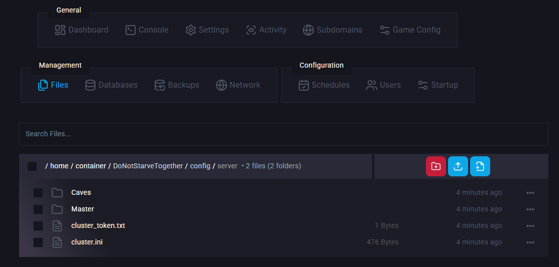 Go to the Files tab & Navigate to: home/container/DoNotStarveTogether/config/server