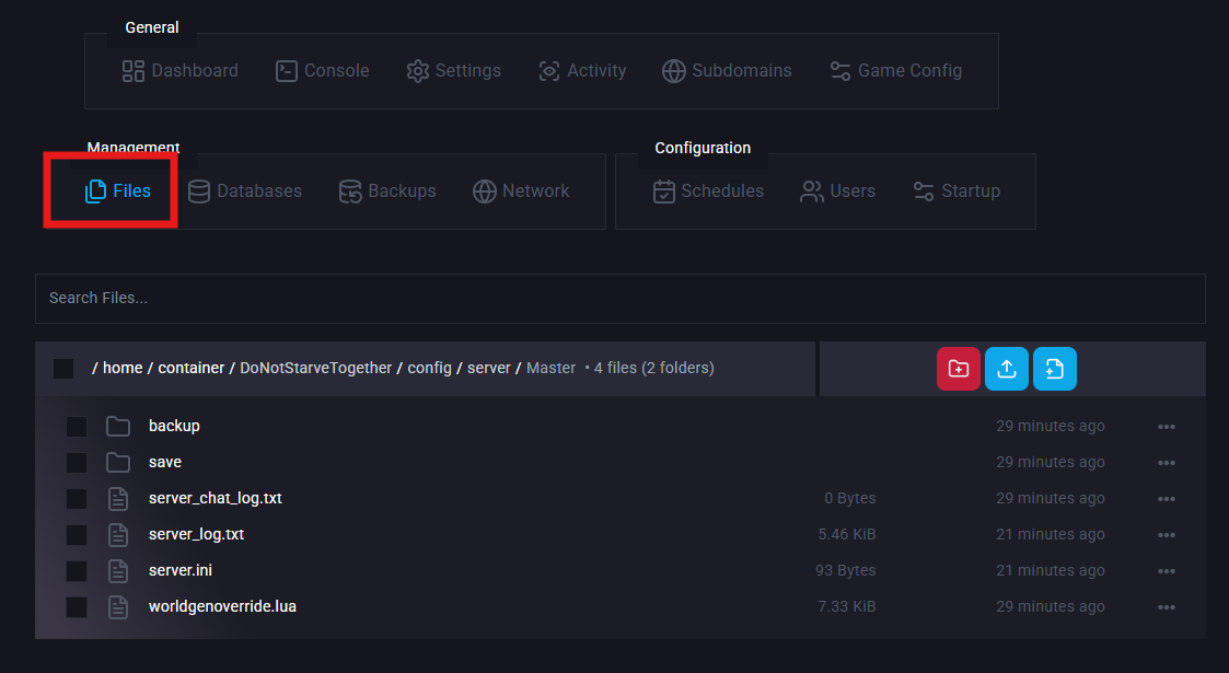 Go to Files & Navigate to the following directory:/home/container/DoNotStarveTogether/config/server/Master