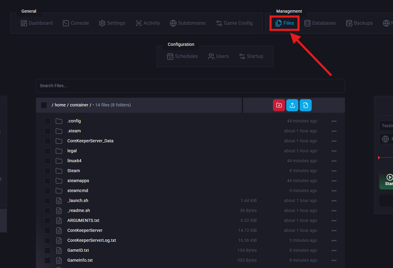 Navigate to the Worlds folder by opening:/home/container/.config/unity3d/Pugstorm/Core Keeper/DedicatedServer/worlds