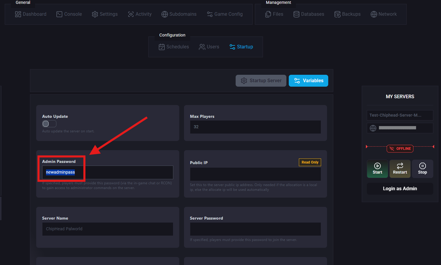 Use the command /adminpassword followed by the Admin Password set in step 5: