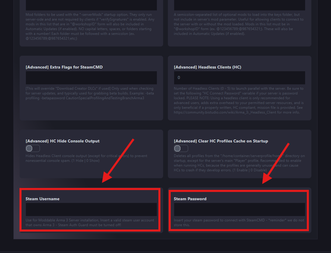 To comply with Steam’s Terms & Conditions, our servers use SteamCMD for authorization which does not store any of your Steam data. You will be required to temporarily enter your Steam username and Password so SteamCMD can verify ownership and download the server files. A valid Steam account with Steam Guard turned off and an active Arma 3 license is required for your modded server.