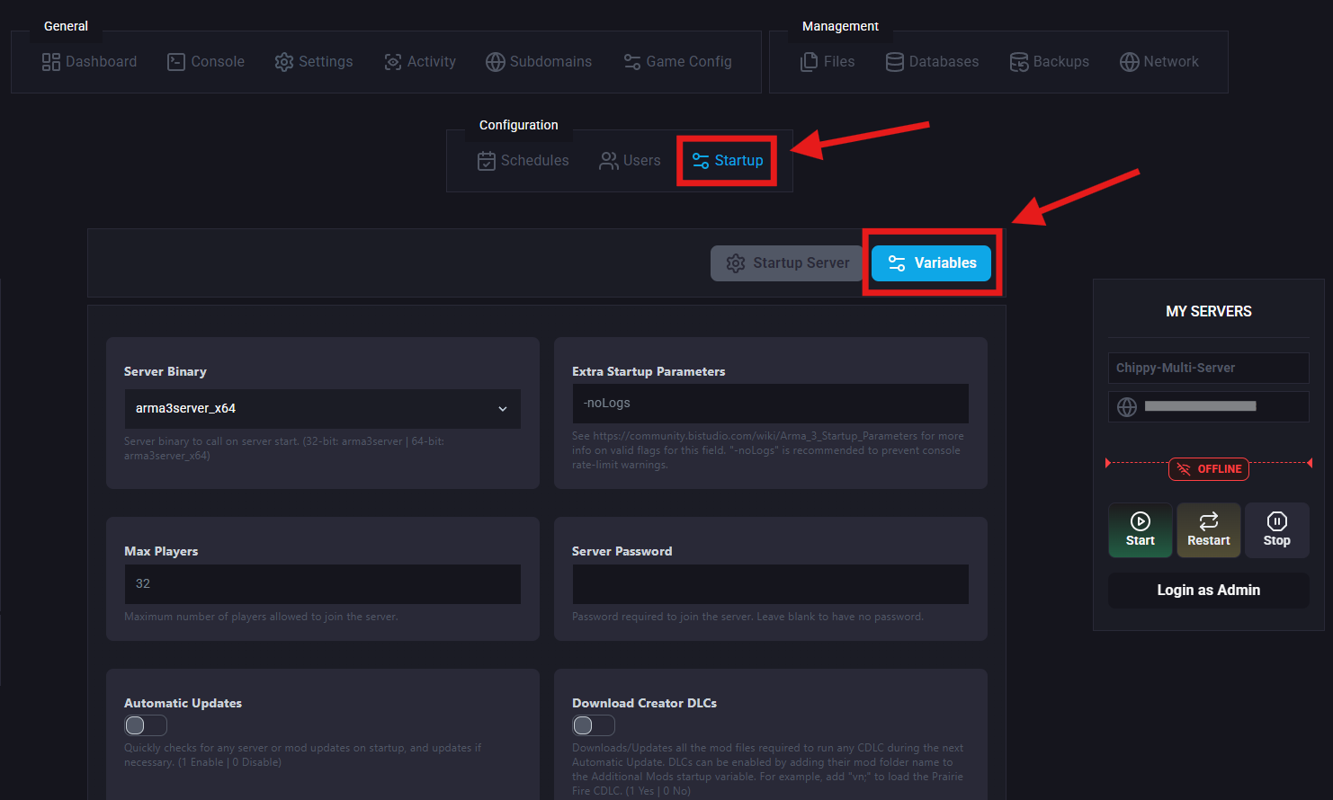 Once you have Arma 3 installed on your ChipHead server, DO NOT start the server yet as you will need to use your steam credentials first.