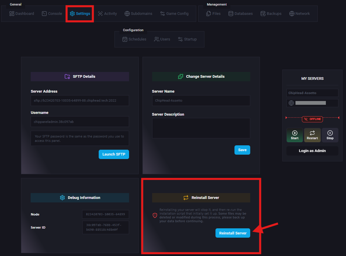 Navigate to “Settings” and select “Reinstall Server”