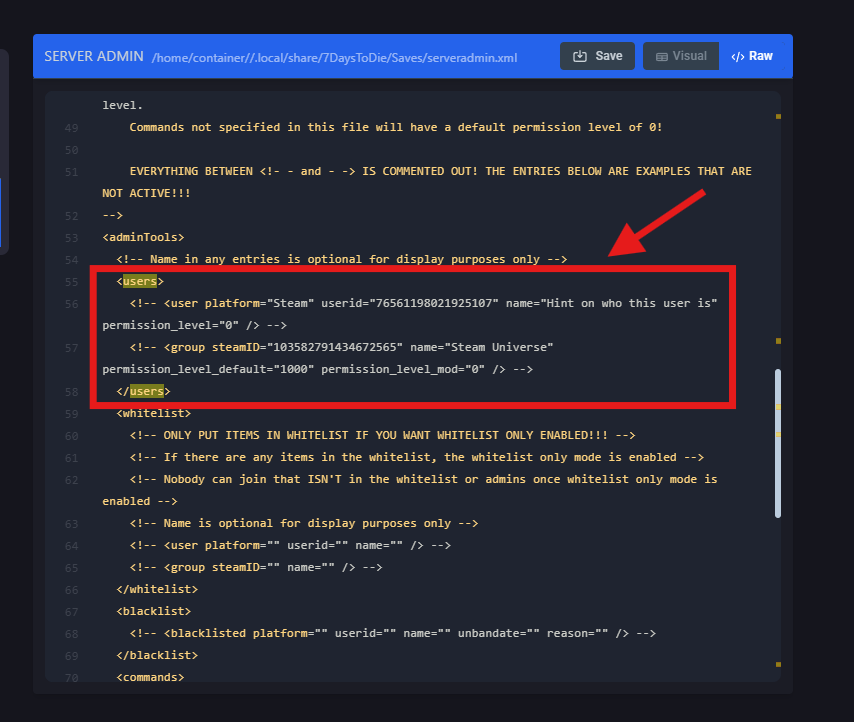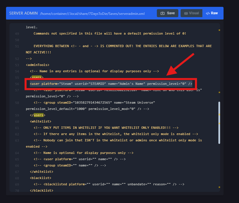 <user platform="Steam" userid="STEAMID" name="Admin's Name" permission_level="0" />