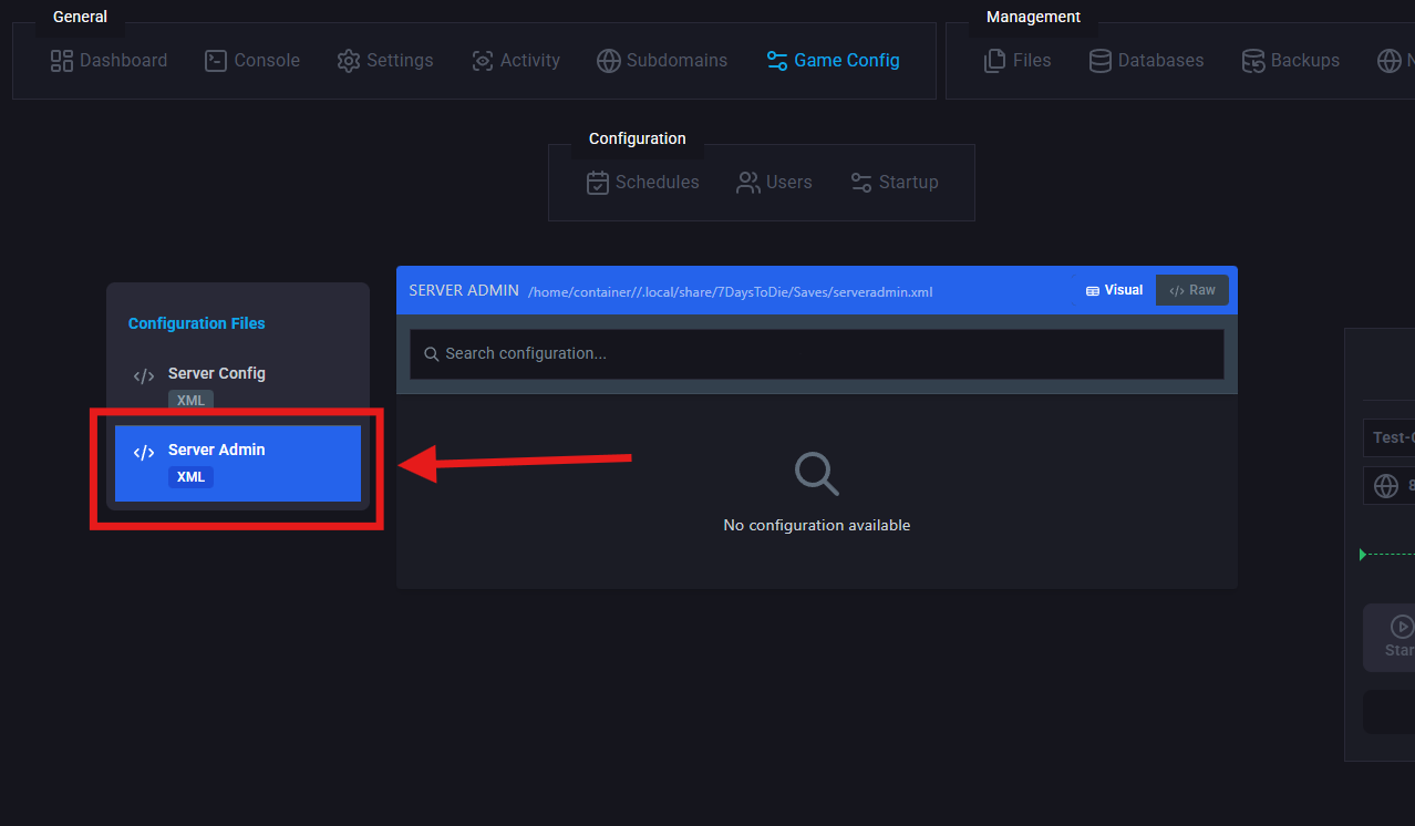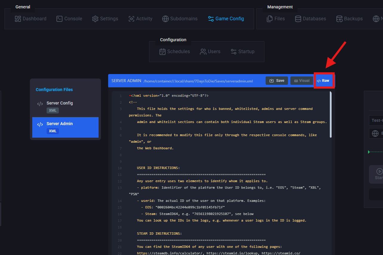 Click on </>Raw to access the serveradmin.xml file.