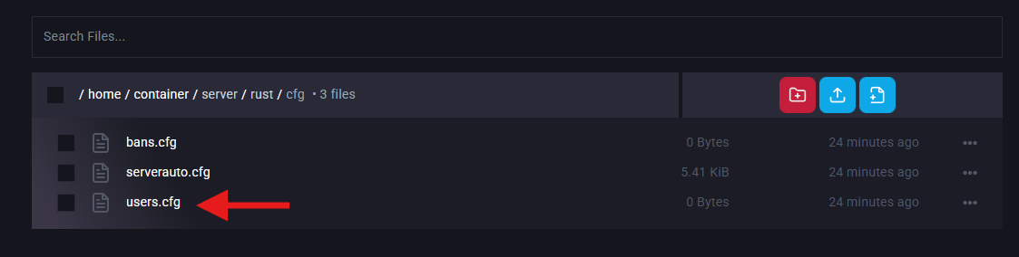 Open the Files tab & Navigate to the following directory:/home/container/server/rust/cfg Open users.cfg for editing.