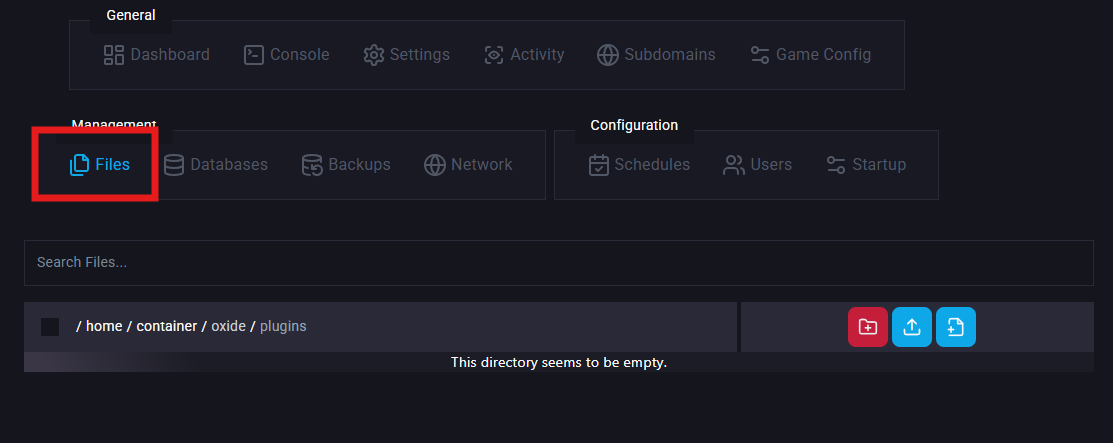Open the Files tab & Navigate to the following directory:/home/containers/oxide/plugins