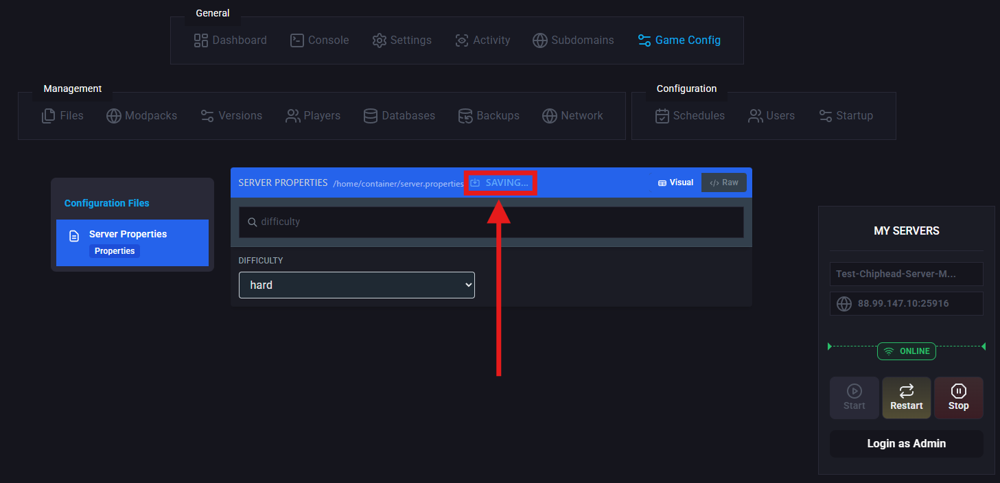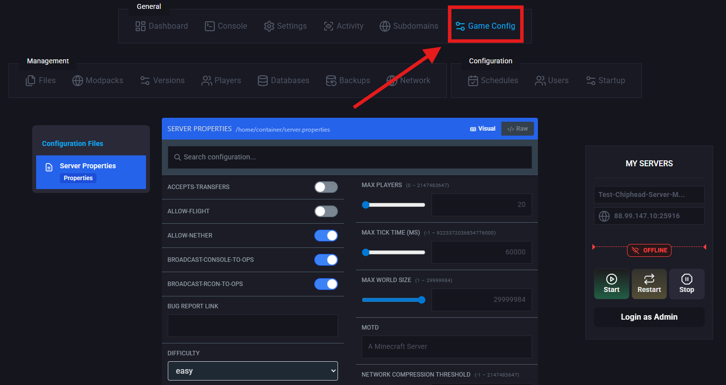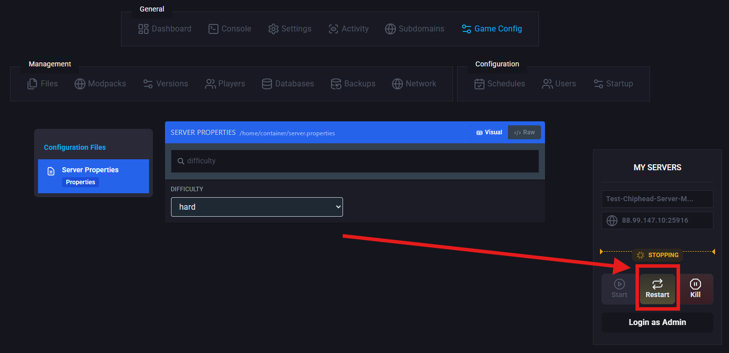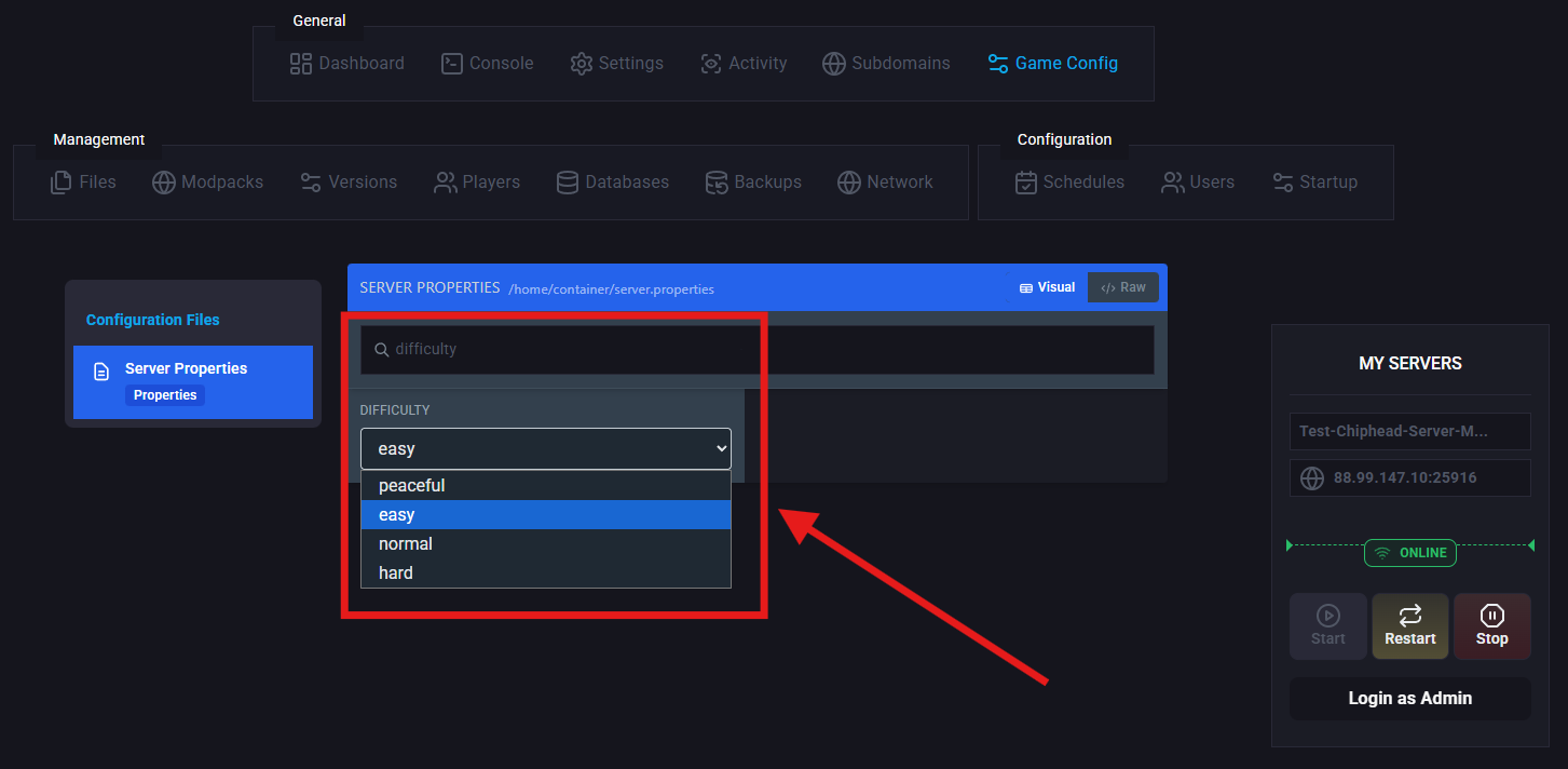 difficulty [peaceful | easy | normal | hard]Log in to the ChipHead Panel.